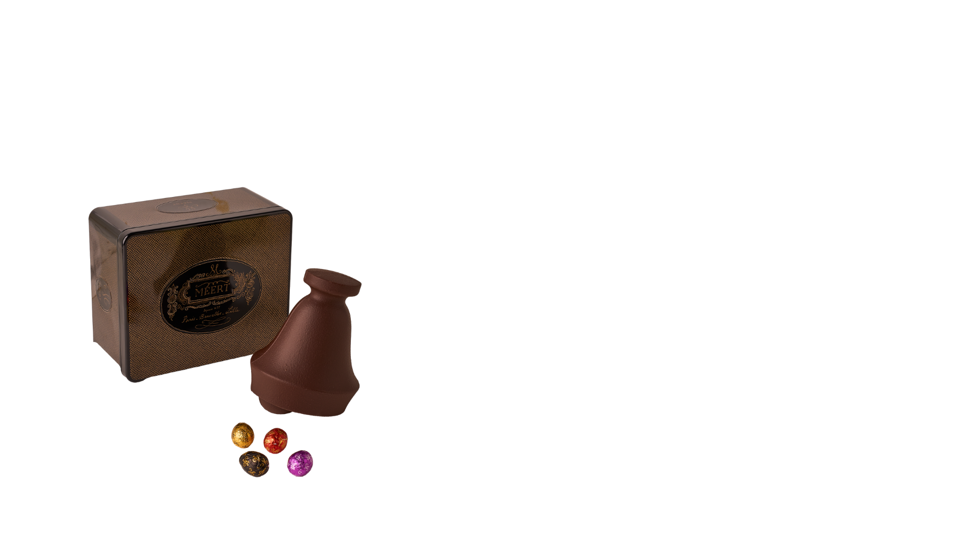 Dark chocolate Easter Bell with little chocolate eggs (milk chocolate, dark chocolate and white chocolate).